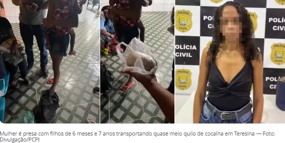 Uma mulher foi presa por volta das 5h deste sábado (20), em Teresina, com os filhos de 6 meses e 7 anos, transportando quase meio quilo de cocaína. Ela informou que levaria a droga para a cidade de José de Freitas, cidade distante cerca de 30 km da capital.