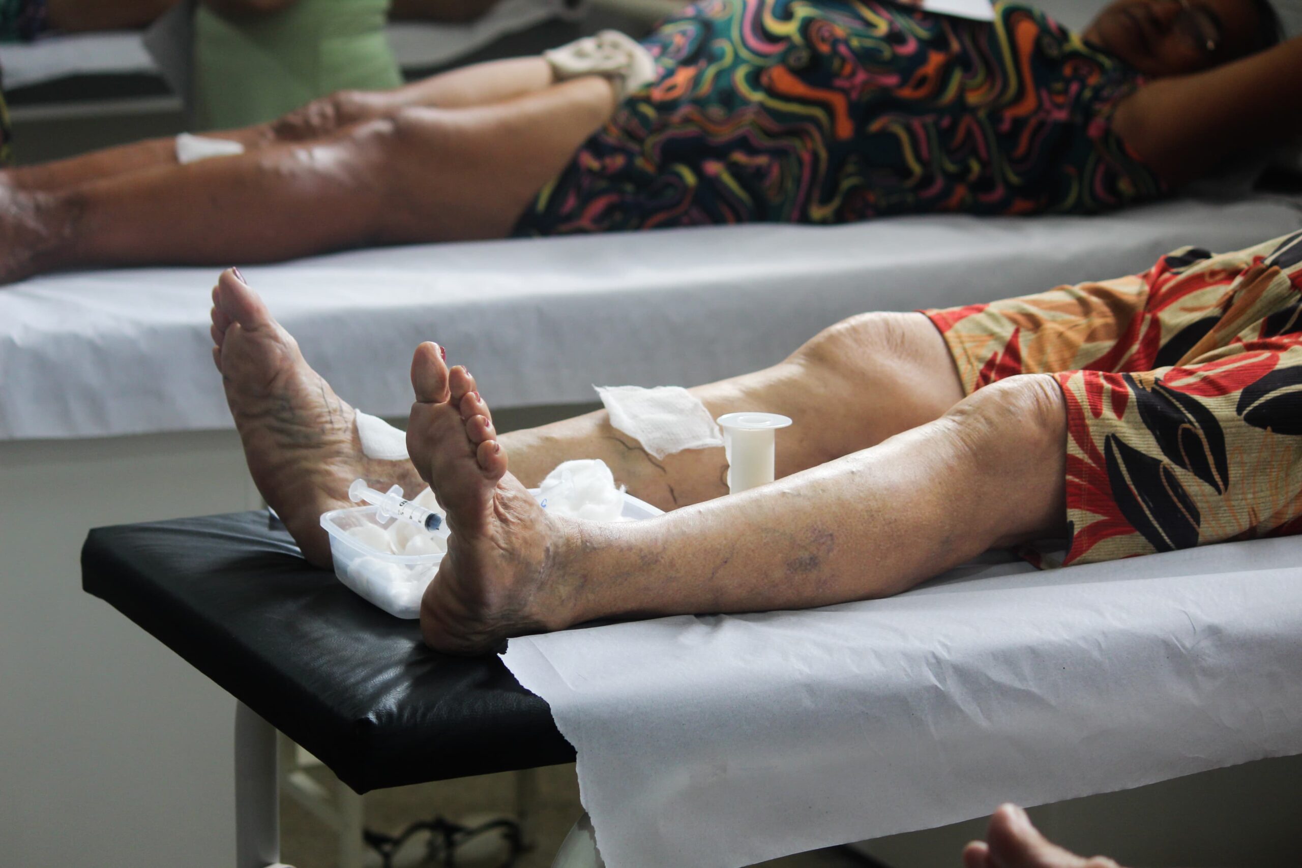 Nesta quinta-feira (23), o Centro de Especialidades Adauto Coelho Rezende estava lotado, com muitos pacientes em busca de tratamento. Durante o dia, os pacientes passaram por um procedimento chamado escleroterapia, indicado para tratar veias dilatadas de diversos tamanhos, desde vasinhos finos e avermelhados até varizes mais grossas.