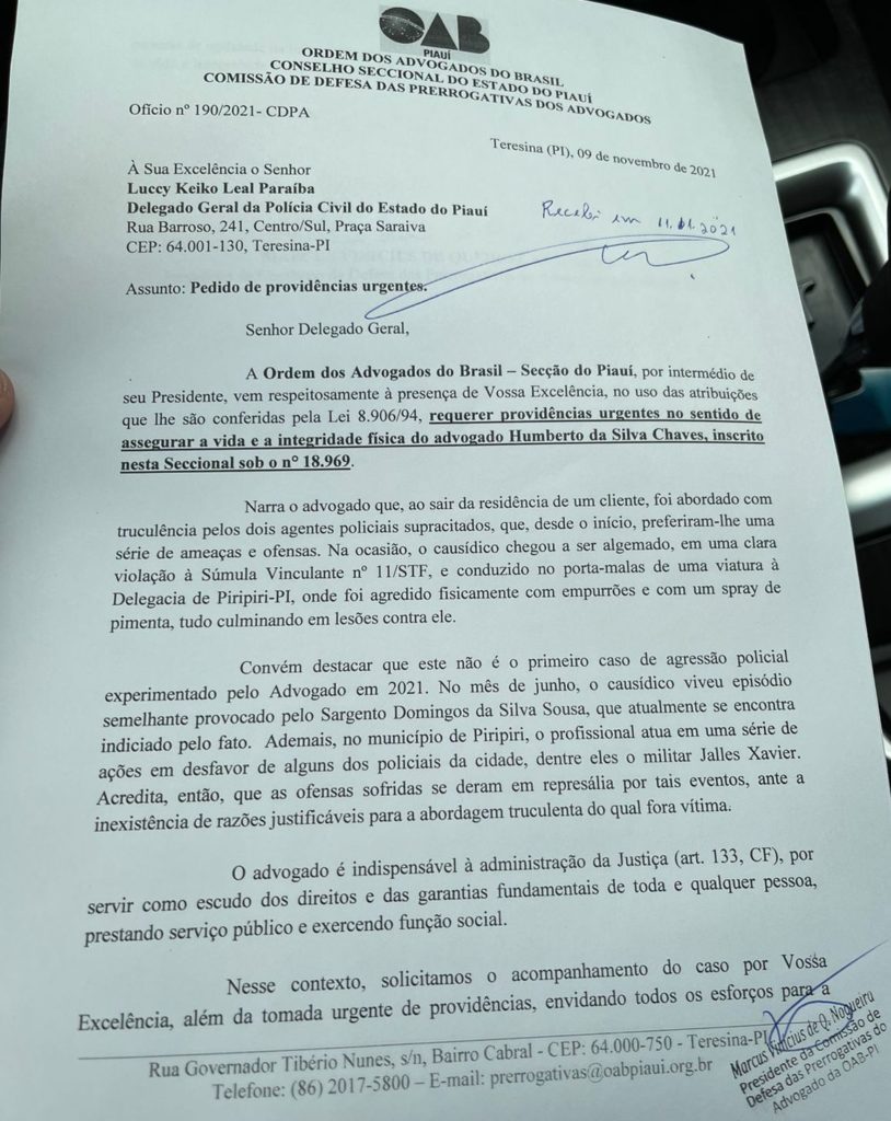 A Comissão de Defesa das Prerrogativas dos Advogados da Ordem dos Advogados do Brasil, Secção Piauí, vem a público manifestar repúdio ao lamentável fato ocorrido no dia 05 de novembro de 2021, nas dependências da Delegacia de Polícia de Piripiri-PI, e reafirmar o seu incondicional apoio ao Advogado Humberto da Silva Chaves, vítima de agressões físicas e verbais por parte do Policial Militar Jalles de Lima Xavier e do Policial Rodoviário Federal Miguel Meneses, em razão de seu exercício profissional.