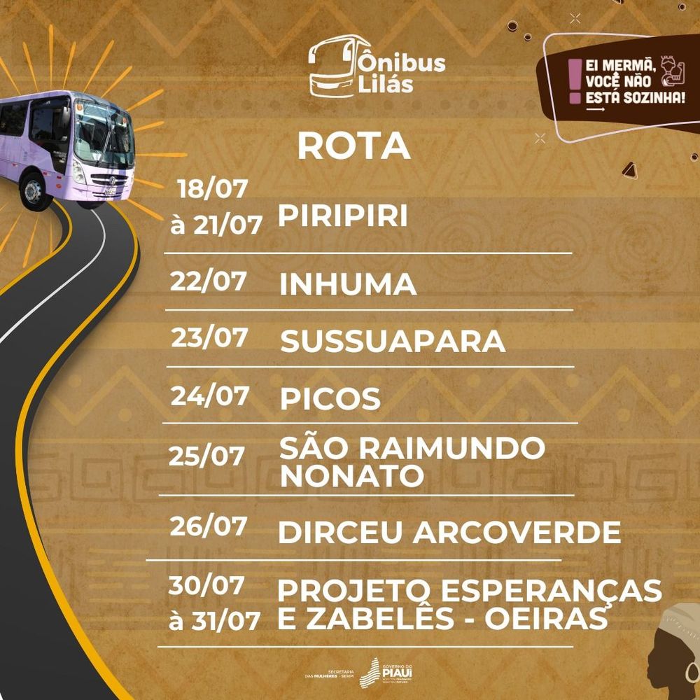 No dia 18, o Ônibus Lilás chegará a Piripiri, integrando as atividades do Pirifolia, onde permanecerá até o dia 21 de julho. Em Inhuma, o ônibus chega no dia 22. Após Sussuapara, no dia 23, o Ônibus Lilás irá a Picos, no dia 24; São Raimundo Nonato, no dia 25, durante o Festival Ópera da Serra da Capivara; e Dirceu Arcoverde, no dia 26. Nos dias 30 e 31 de julho, o Ônibus Lilás estará em Oeiras, atendendo as comunidades quilombolas Canadá Corrente, Cantinho Corrente, Queiroz e Canto Fazenda Frade.