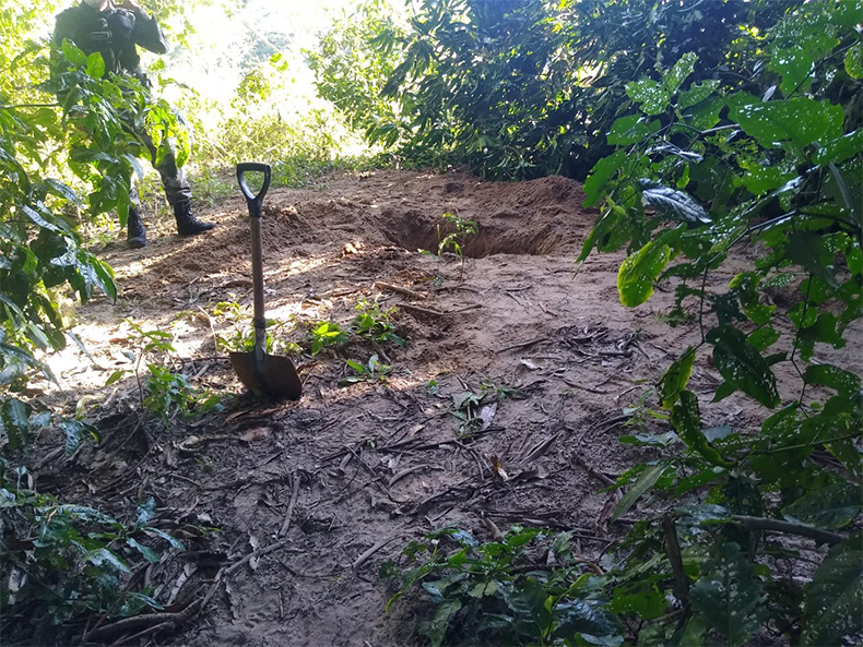 “Feito uma varredura na área de mato, localizamos uma suposta cova, iniciamos uma escavação, onde fora encontrado indícios de um cadáver e solicitamos apoio do Corpo de Bombeiros”, informou o relatório da Força Tática.