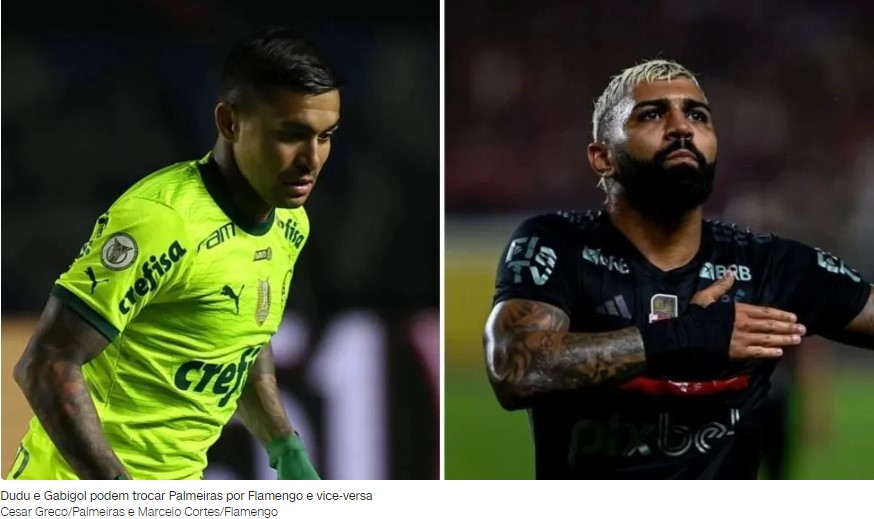 Palmeiras e Flamengo negociam uma troca de jogadores que já foram considerados ídolos absolutos nos clubes. Interessado no centroavante Gabigol, o Alviverde pode ceder o atacante Dudu para viabilizar uma transferência imediata e ganhar um novo reforço para o setor ofensivo.