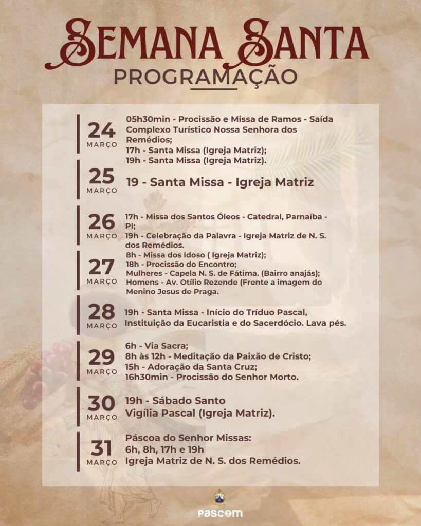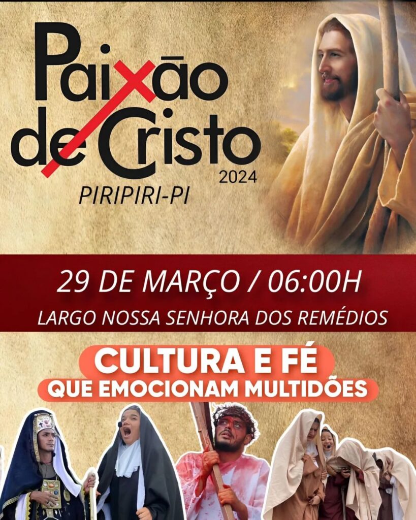 Acompanhe a encenação do espetáculo A Paixão de Cristo 2024 no dia 29 de março, às 6h da manhã, no Largo Nossa Senhora dos Remédios, em Piripiri-PI.