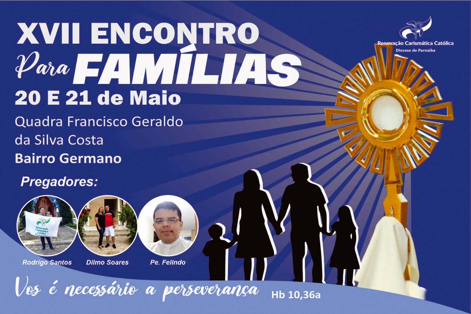 A Renovação Carismática Católica (RCC) da Paróquia de Nossa Senhora dos Remédios, em Piripiri – PI, realiza sábado e domingo, dias 20 e 21, o XVII Encontro para as Famílias 2023 com o tema “Vos é necessário a Perseverança”. A abertura será com Santa Missa na Igreja Matriz de Nossa Senhora dos Remédios, às 19h desta sexta, dia 19 de maio.