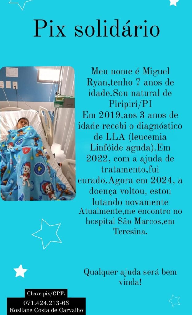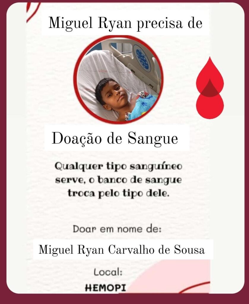 Participe da campanha de doação de sangue e Pix Solidário em prol da saúde do garotinho Miguel Ryan em Piripiri