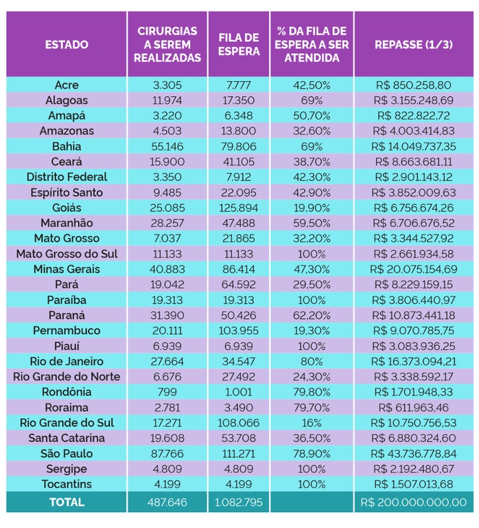 Dentro das ações do programa nacional, o Governo Federal vai realizar um repasse financeiro de R$ 600 milhões, divididos em três parcelas de R$ 200 milhões, para que os estados consigam reduzir as filas de esperas para cirurgias eletivas. Para o Piauí, inicialmente, será destinado o valor de R$ 3.083.936,25. “Este repasse de pouco mais de R$ 3 milhões é o primeiro de três, que o Ministério se comprometeu em enviar aos estados. No plano, cada secretaria estadual estabeleceu as cirurgias prioritárias, de acordo com a realidade local e nós, do Piauí, vamos fazer toda a nossa demanda, atingindo 100% da fila de espera”, ressalta o secretário de Estado da Saúde, Antonio Luiz.