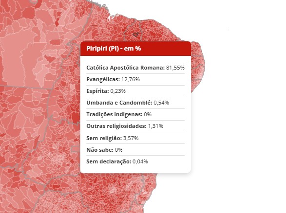 Os resultados consideram as afirmações de pessoas de 10 anos ou mais sobre religiões e cultos. No Piauí, 77,4% da população do estado declara ser católica, enquanto 15,6% diz ser evangélica, um incremento de 5,99 pontos percentuais em relação a 2010, quando representava 9,57%.