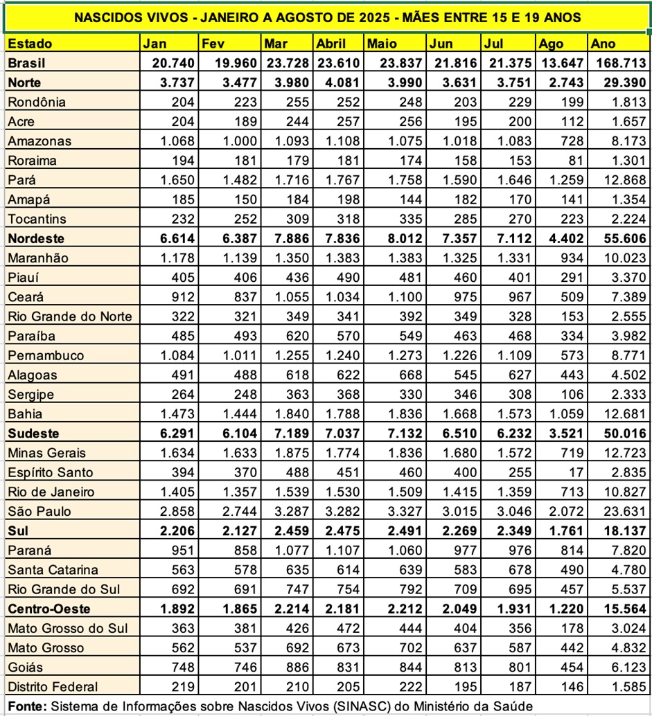 A adolescência é um período de intensas transformações físicas, emocionais e sociais, marcado pela construção de sonhos, planos e projetos de vida. No entanto, desafios como a gravidez não planejada ainda impactam de forma significativa a trajetória de muitos jovens no Brasil. Apesar das campanhas de prevenção à gravidez precoce e do incentivo ao uso de preservativos — medida essencial também para a prevenção de infecções sexualmente transmissíveis (ISTs) —, o país segue enfrentando números expressivos. Entre janeiro e agosto de 2025, o Brasil registrou 168.713 nascimentos de bebês, filhos de mães com idades entre 15 e 19 anos, segundo dados do Sistema de Informações sobre Nascidos Vivos (Sinasc) do Ministério da Saúde, compilados em 27 de janeiro de 2026 pela Organização Nacional de Acreditação (ONA). Já em 2024, entre janeiro e agosto, foram 179.428 nascimentos, totalizando 261.206 ao final do ano. Com o objetivo de ampliar a conscientização e promover a educação em saúde entre adolescentes e jovens, o governo instituiu a Semana Nacional de Prevenção da Gravidez na Adolescência, realizada anualmente na primeira semana de fevereiro, entre os dias 1º e 8. No estado do Piauí, entre janeiro e agosto de 2025, foram 3.370 nascidos vivos filhos de mães da faixa etária. Já em 2024, 3.535 no mesmo período do ano. |