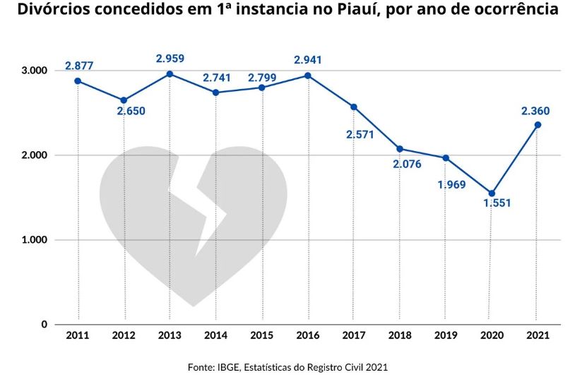 Em 2021, a pesquisa das Estatísticas do Registro Civil do IBGE apurou 2.360 divórcios concedidos no Piauí, o que representa um aumento de 52,1% em relação ao total contabilizado em 2020 (1.551). Considerando a série histórica, o ano de 2020 foi atípico e a queda acentuada no número de divórcios pode estar associada ao período da pandemia de COVID-19, considerando o afastamento social e a paralisação temporária de muitos serviços, inclusive o andamento de processos judiciais. Nos últimos dez anos o maior número de divórcios aconteceu em 2013 e 2016, quando foram deferidos, respectivamente, 2.959 e 2.941 divórcios.