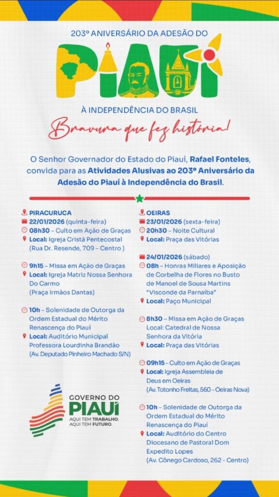 No sábado (24), Rafael Fonteles participa, pela manhã, das solenidades cívicas em Oeiras. A agenda inclui honras militares e aposição de corbelha de flores no busto de Manoel de Sousa Martins, o Visconde da Parnaíba, além de celebrações religiosas e da solenidade de outorga da Ordem Estadual do Mérito Renascença do Piauí, que acontecerá no auditório do Centro Diocesano de Pastoral Dom Expedito Lopes, encerrando a programação comemorativa neste mês.