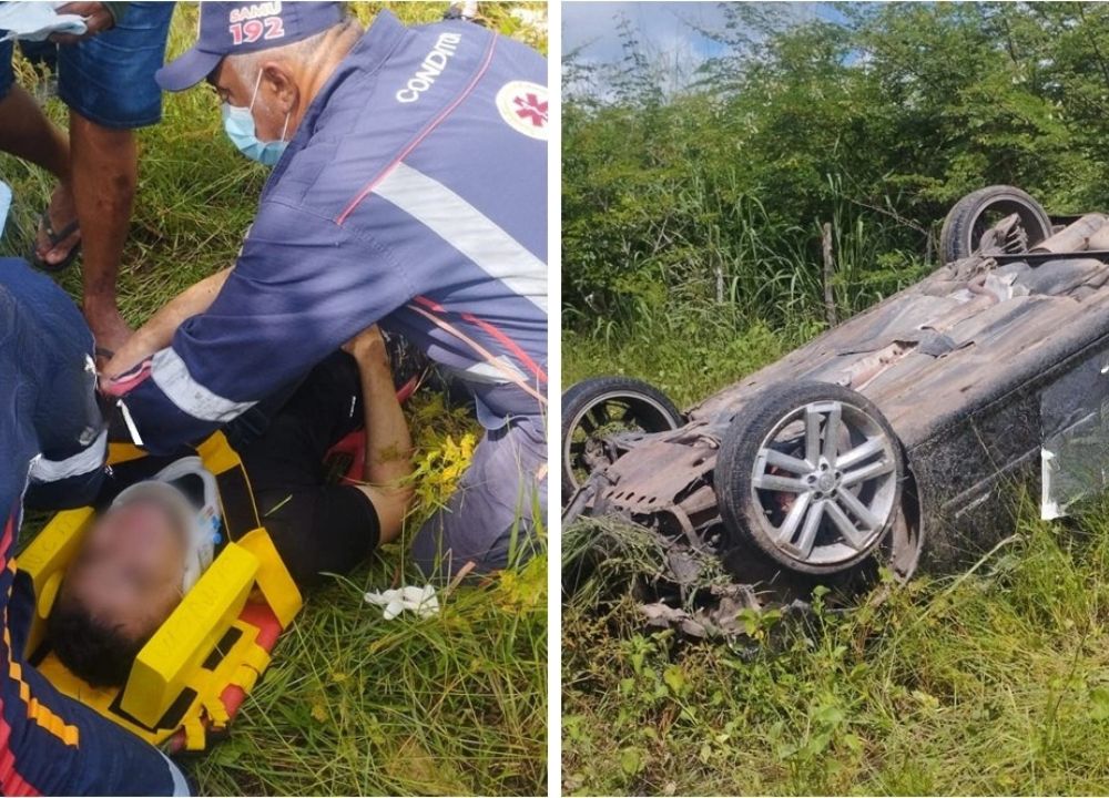 De acordo com informações repassadas pela própria vítima, o acidente aconteceu após o carro colidir com uma motocicleta ocupada por três pessoas. Com o impacto, o veículo saiu da pista e capotou, ficando com as rodas para cima.