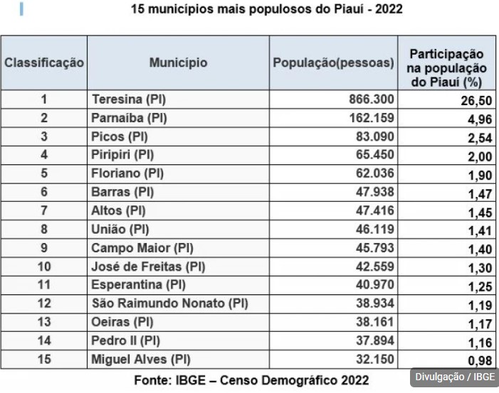 O Piauí registrou 3.269.200 milhões habitantes, um crescimento de 4,81% em relação ao Censo de 2010. O dado é do Censo Demográfico 2022, divulgado pelo Instituto Brasileiro de Geografia e Estatística (IBGE) nesta quarta-feira (28). Veja o resultado de cada cidade piauiense clicando nos links ao fim da reportagem.