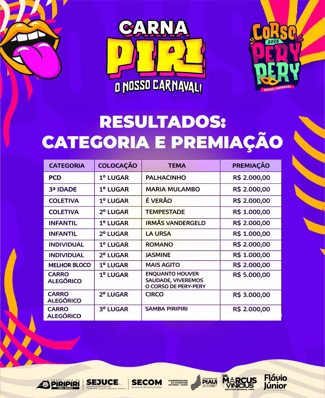 A Prefeitura Municipal de Piripiri, por meio da Secretaria de Juventude, Cultura, Esporte e Turismo (SEJUCE), anunciou os vencedores do Corso 2026, realizado na sexta-feira, 6 de fevereiro, durante a abertura do Carna Piri. O evento reuniu milhares de pessoas nas avenidas da cidade, com fantasias criativas e grande participação popular.
