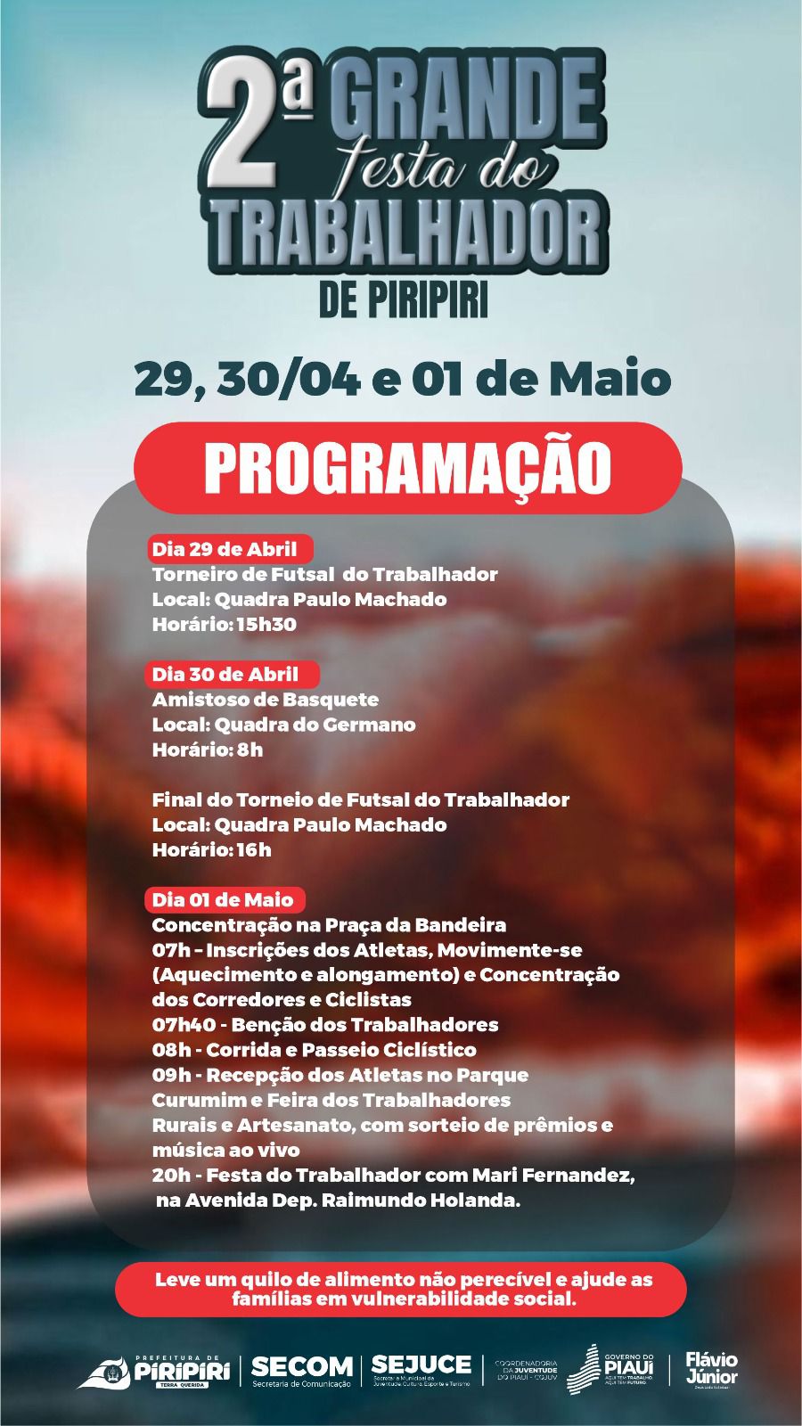 A partir de sábado (29/04), começará a programação da 2ª Grande Festa do Trabalhador, em Piripiri-PI, com muitas atividades esportivas e que culminarão com show da cantora Mari Fernandez na segunda-feira (dia 1º), festejando o Dia do Trabalhador, no palco montado na Av. Raimundo Holanda Sobrinho, zona Leste da cidade.