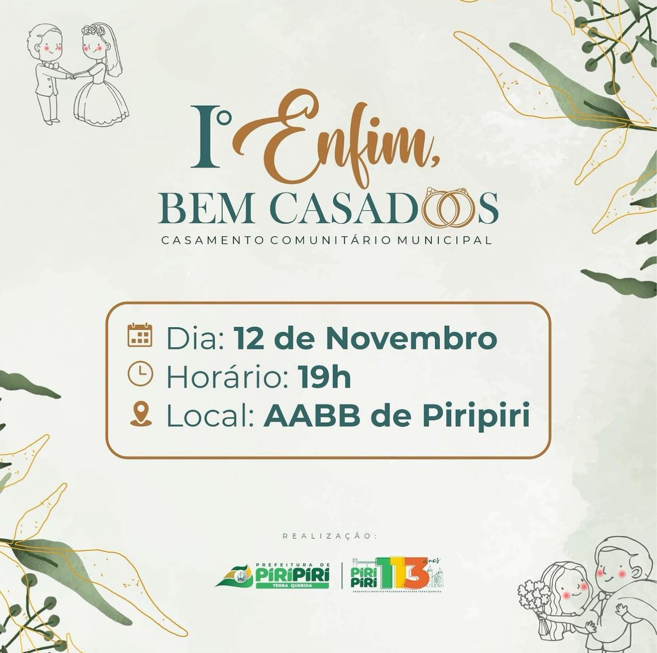 A Prefeitura Municipal de Piripiri, em parceria com o Tribunal de Justiça do Estado do Piauí e o cartório do 2º Ofício, da Dra. Geórgia Medeiros, realiza neste domingo (12/11) o casamento comunitário oficial do projeto Enfim, Bem-casados. O evento acontece às 19h, na AABB de Piripiri.