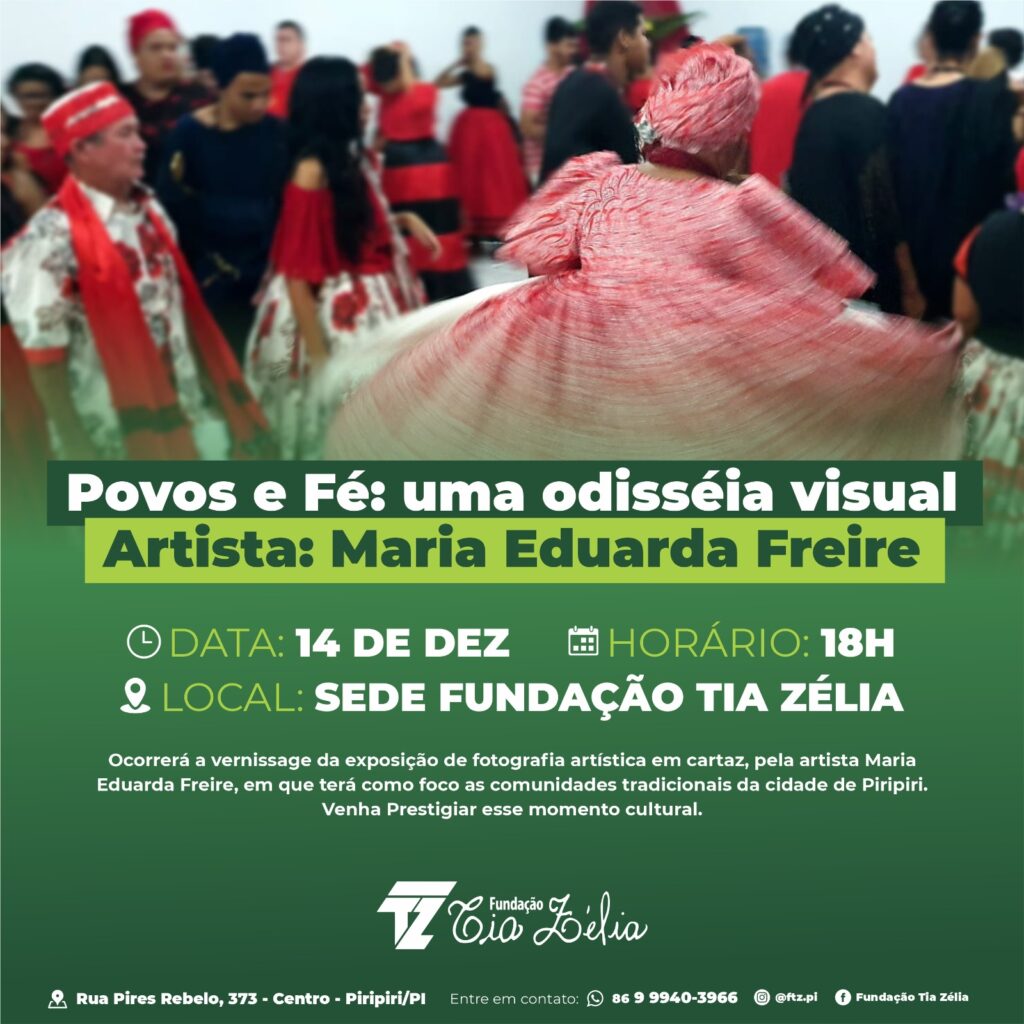 Hoje quinta-feira, dia 14 de dezembro, prestigie a vernissage da exposição Povos e Fé : uma odisseia visual da artista Maria Eduarda Freire, a partir das 18h na Fundação Tia Zélia de Piripiri !