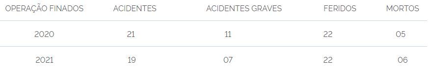 Durante os cinco dias de operação, a PRF contabilizou 19 acidentes, sendo 07 de natureza grave, 22 feridos e 06 óbitos. Apesar da redução no número de acidentes , houve um leve aumento no número de mortos se comparado ao mesmo período em 2020. Se compararmos o número de acidentes com o número de feridos e mortos, constata-se um aumento no índice de letalidade.