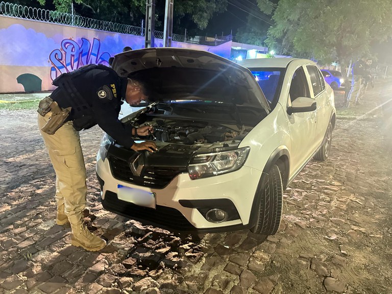 Ato contínuo, foi dada ordem de parada ao referido veículo. Os agentes verificaram que o automóvel não estava registrado no nome do condutor. Dessa forma, a equipe procedeu à identificação veicular e constatou que a placa aparente não correspondia aos dados consultados. Durante a fiscalização, outros indícios de adulteração foram identificados. Após consultas aos sistemas públicos disponíveis e à análise de elementos de identificação remanescentes, foi constatado que o veículo original era também um RENAULT/LOGAN, porém com registro de estelionato na 9ª Delegacia de Polícia de Carandiru, vinculada à Polícia Civil do Estado de São Paulo, com data de 12/07/2021.