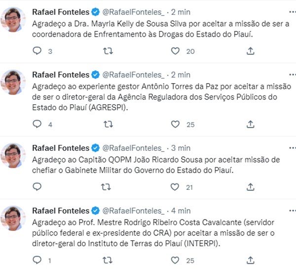 O governador eleito Rafael Fonteles (PT) anunciou no final da manhã desta segunda-feira (5) mais quatro nomes para equipe do primeiro e segundo escalão do governo. A confirmação foi através do Twitter de Rafael Fonteles.