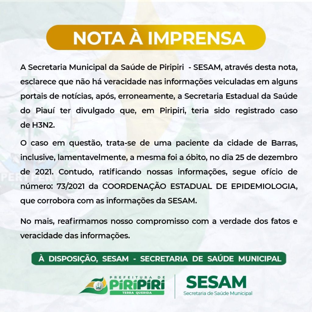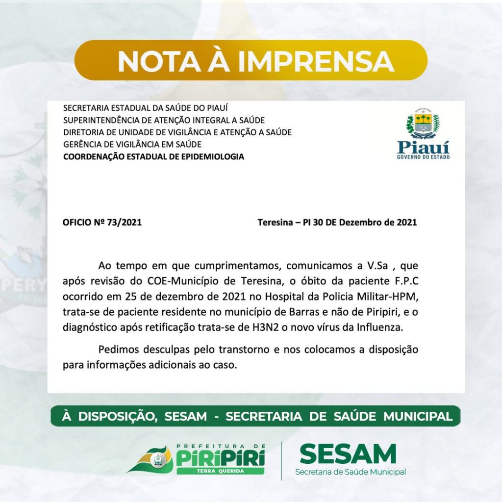 Sec. Municipal de Saúde de Piripiri e Sesapi emitem nota após divulgação errada em alguns sites sobre um óbito por H3N2 na cidade