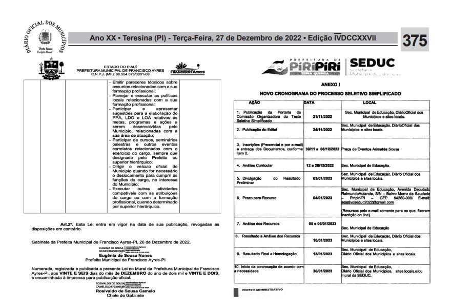 As mudanças no calendário do Teste Seletivo foram publicadas no Diário Oficial dos Municípios na última quarta-feira (21), a Errata Nº 03, e nesta terça-feira (27/12), a Errata Nº 04. Com isso, a SEDUC terá mais tempo para o julgamento e avaliação dos currículos para a divulgação do Resultado Preliminar agendado para o dia 03 de janeiro de 2023.