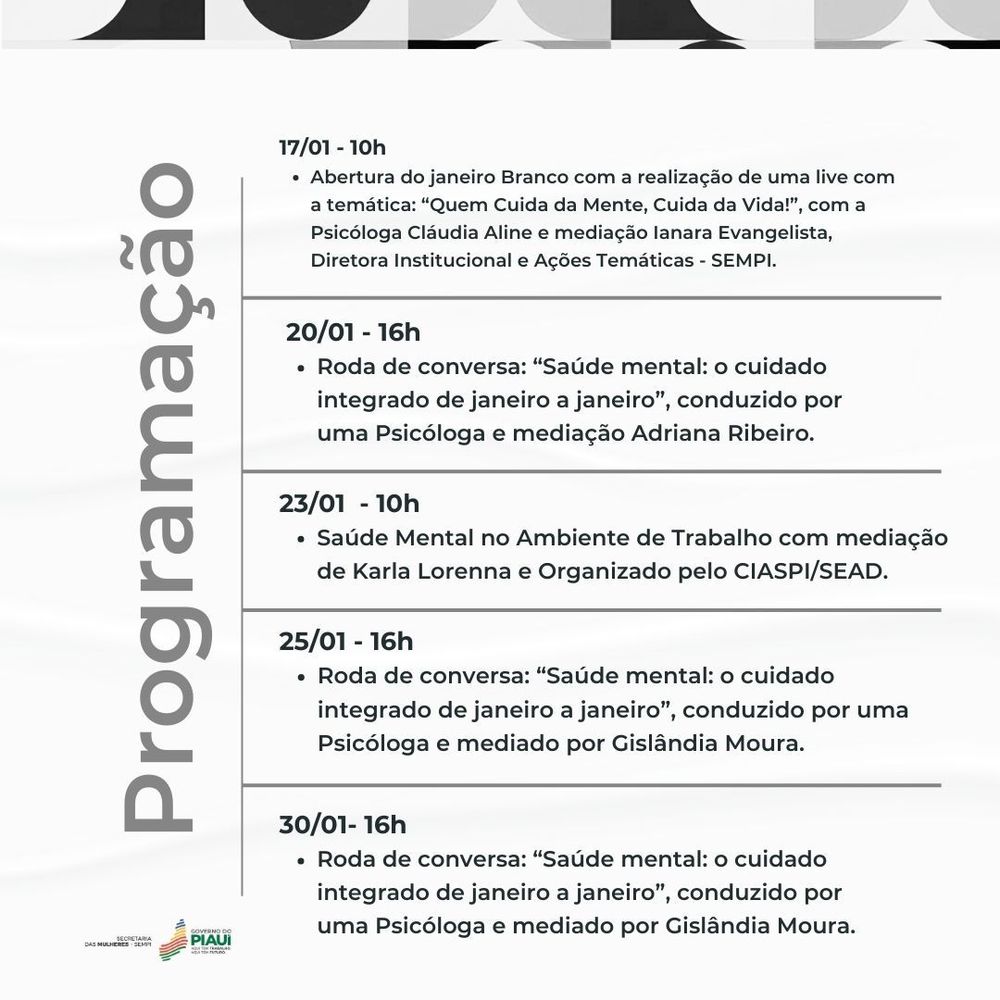 17/01 às 10h – Abertura do Janeiro Branco com uma live temática – “Quem Cuida da Mente, Cuida da Vida!”, com a Psicóloga Cláudia Aline (SESAPI), no Instagram.