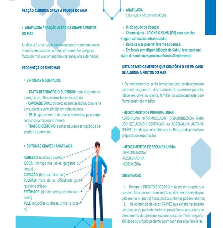 No “Plano de Ação – Aja o mais rápido possível”, elaborado pela Sesapi, constam uma série de informações sobre anafilaxia, um tipo de reação alérgica grave que pode matar em poucos minutos em caso de contato com alimentos alérgicos, como frutos-do-mar, ovo, amendoim, castanha, leite e derivados.