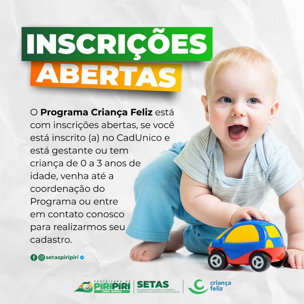 Estão abertas as inscrições para o programa Criança Feliz, em Piripiri, que atende crianças da primeira infância, de 0 a 3 anos, as crianças com necessidades especiais beneficiárias do LOAS/ BPC (Benefício de Prestação Continuada) e gestantes. O programa é executado em Piripiri pela Prefeitura Municipal, por meio da Secretaria de Trabalho, Assistência e Desenvolvimento Social (SETAS).