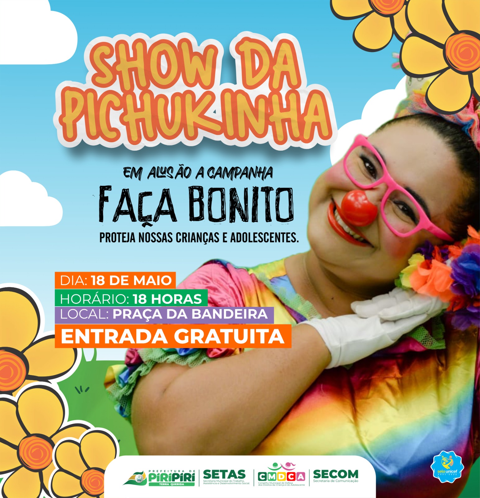 O “Show da Pichukinha” em alusão à Campanha Faça Bonito – Maio Laranja será amanhã (18/05), a partir das 18h, na Praça da Bandeira, no Centro de Piripiri. A entrada é gratuita!