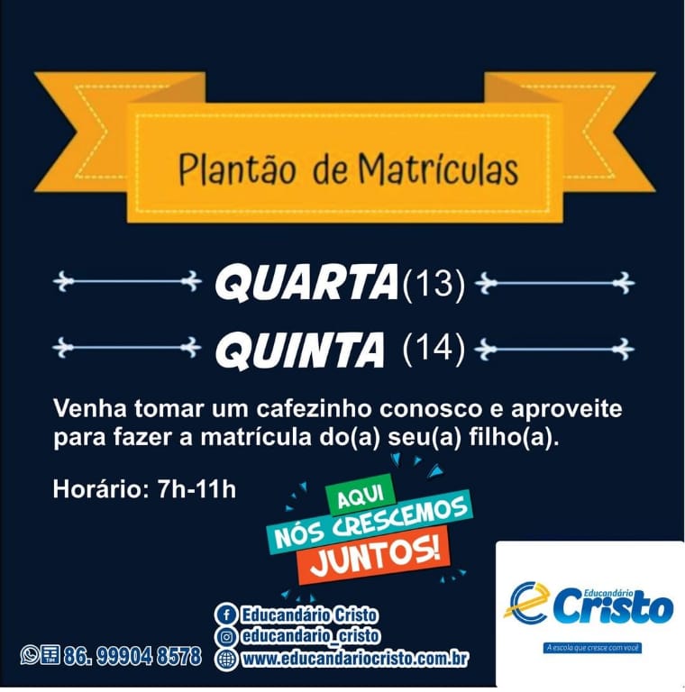 O Educandário Cristo informa que nesta semana, em decorrência do feriado do festejos, estará de plantão nos dias 13 e 14 de outubro, no horário de 7h as 11h. Momento em que convidamos você a formalizar a matrícula do(a) seu(a) filho(a) e fazer parte desta grande família de sucesso. Informamos também que estamos com campanha de descontos na matrícula para todas as séries da educação básica.