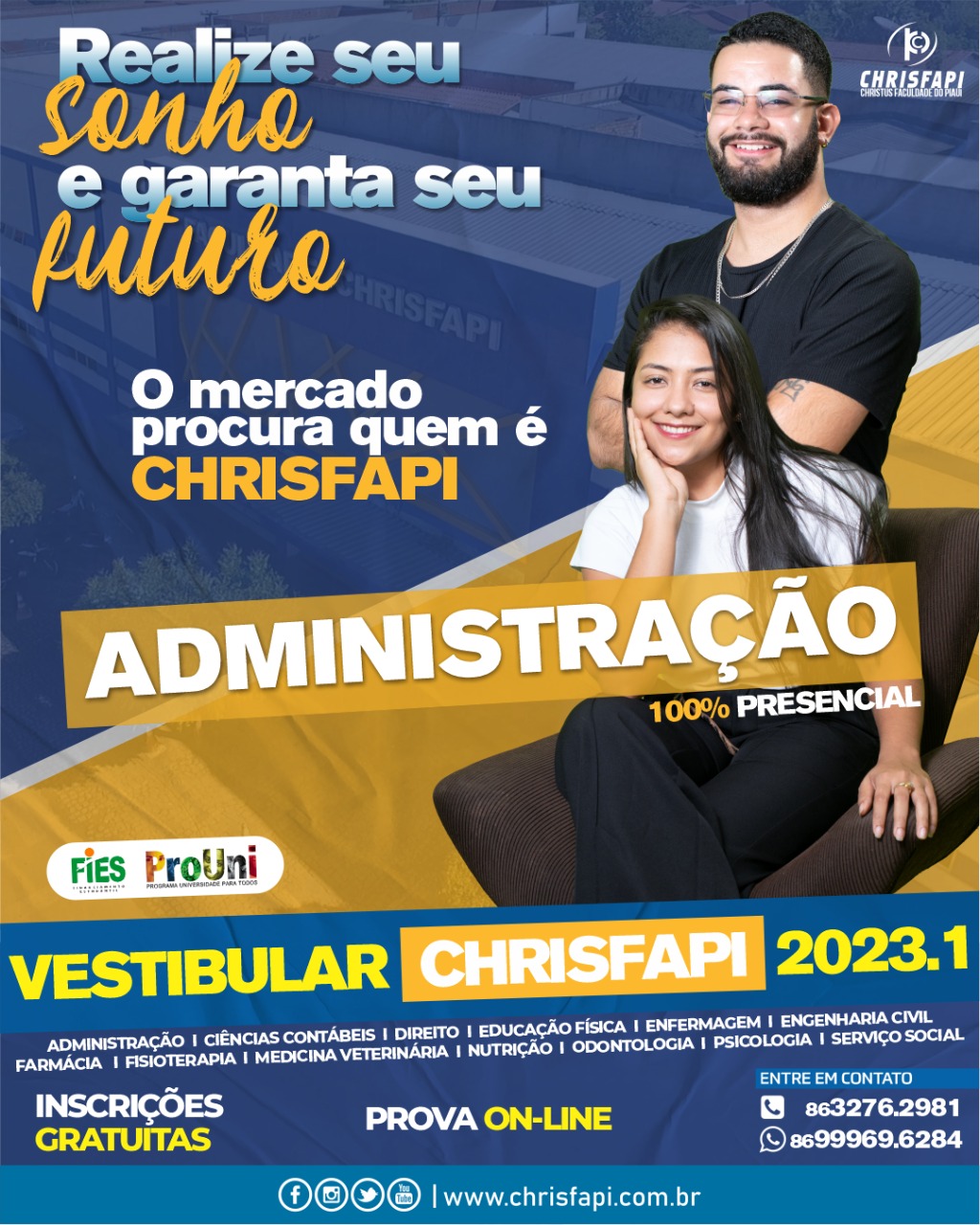 Vestibular da Faculdade Chrisfapi em Administração é uma excelente alternativa para corresponder às exigências do mercado e você pode aderir a Dupla Certificação!