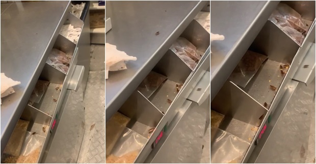 Nas imagens é possível perceber várias baratas nas gavetas, no chão passeando pelos alimentos do quiosque, que fica próximo a