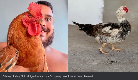 O g1 encontrou o Erlerson Pablo, o dono do Galynaldo. Segundo ele, o galo foi criado, desde quando era um pintinho, por uma pata, a Quaquaquá. Por isso, aprendeu o comportamento de ficar na água com ela.