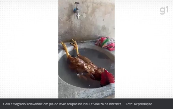 O vídeo de um galo deitado, de papo pra cima, relaxando numa pia de lavar roupa como se fosse uma banheira, viralizou nas redes sociais essa semana. O vídeo já acumulou mais de 7,3 milhões de visualizações.
